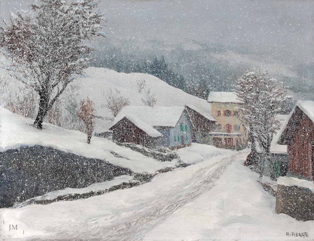 This is an unusual and charming picture by Abrate. It seems to have already snowed a good deal before this blizzard came on and a closer inspection of the painter’s technique shows some rapid passages of painting and broad applications of paint on top of which, Abrate would have flecked all the tiny snowflakes tumbling from the sky. The flat light and deadened atmosphere give the picture a vaguely art naif look as well as an unintended association with the early Flemish painters’ attempts at snowy landscapes.