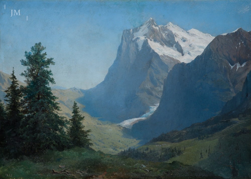 Niederhäusern was a Swiss pupil of Alexandre Calame. He came from Mulhouse originally and was possibly still in Calame’s studio or taking part in his annual summer painting school in Meiringen when he made this oil study in August 1852. One of the first things one notices in this view looking towards the Wetterhorn and the Grosse Scheidegg pass, is the thick band of ice tumbling down towards Grindelwald off the west flank of the mountain. The Upper Grindelwald Glacier has now receded far back up the valley and in its wake, there is now a considerable chasm between the moraines. Notwithstanding the effects of a warming climate, this is still one of the finest views in the Alps, and largely unchanged since Niederhäusern’s time.