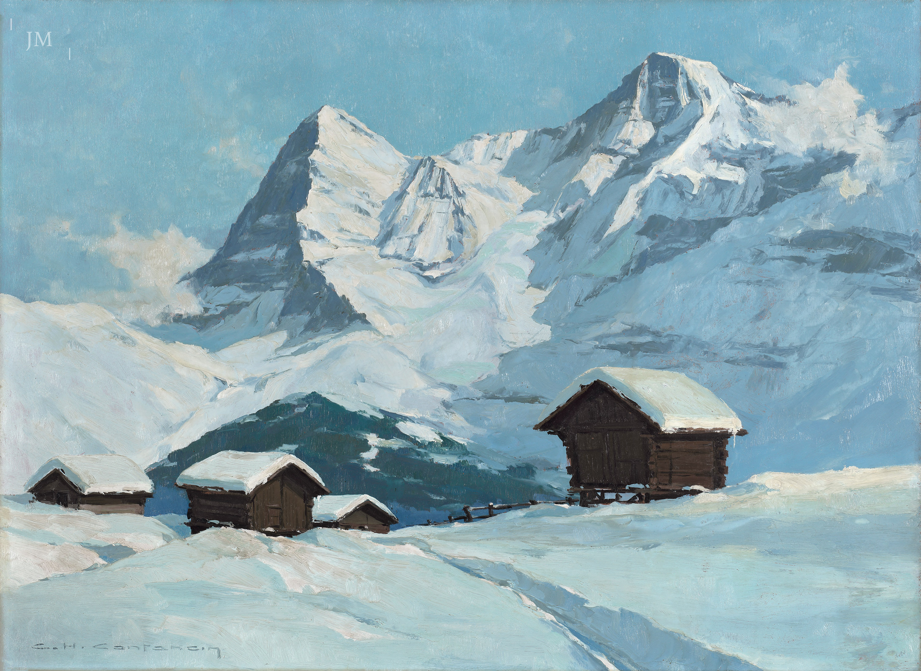 The artist’s inventive motif of tracks in the snow comes into its own in this beautiful scene painted from Mürren. The north faces of the Eiger and the Mönch dominate the horizon and the dark, unlit sides of the haylofts contrast and enhance the sense of distance across the valley. As is often the case in Contencin’s pictures, the confident handling of the foreground here a sloping meadow under deep snow, is the key to both the composition’s success and its visual appeal.