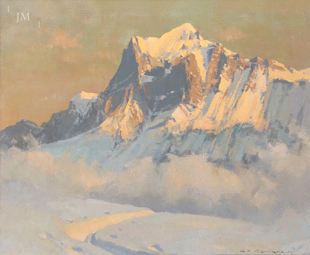 Cut off from the valley by a heavy fog, the tiered and soaring Wetterhorn seems to be even more dominant. With a thorough understanding of his palette, in this instance, Contencin animated the fog with flashes of magenta and umber to prevent it becoming too leaden and his sky too boasts areas of yellow ochre and silver to offset the mass of snow and rock. Despite the cold atmosphere, such use of colour means that his paintings never become too hard nor unconvincing.