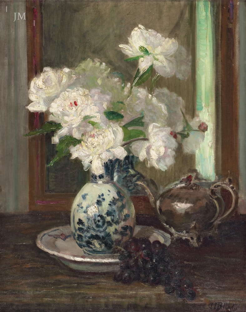 The present example is a handsomely sized still life and shows the artist's debt to, and reverence for, Manet and Chardin. The varying textures of the glazed blue and white porcelain, the peonies and tea pot are loosely painted with a deceptive simplicity, gained from a long experience and understanding of still life.