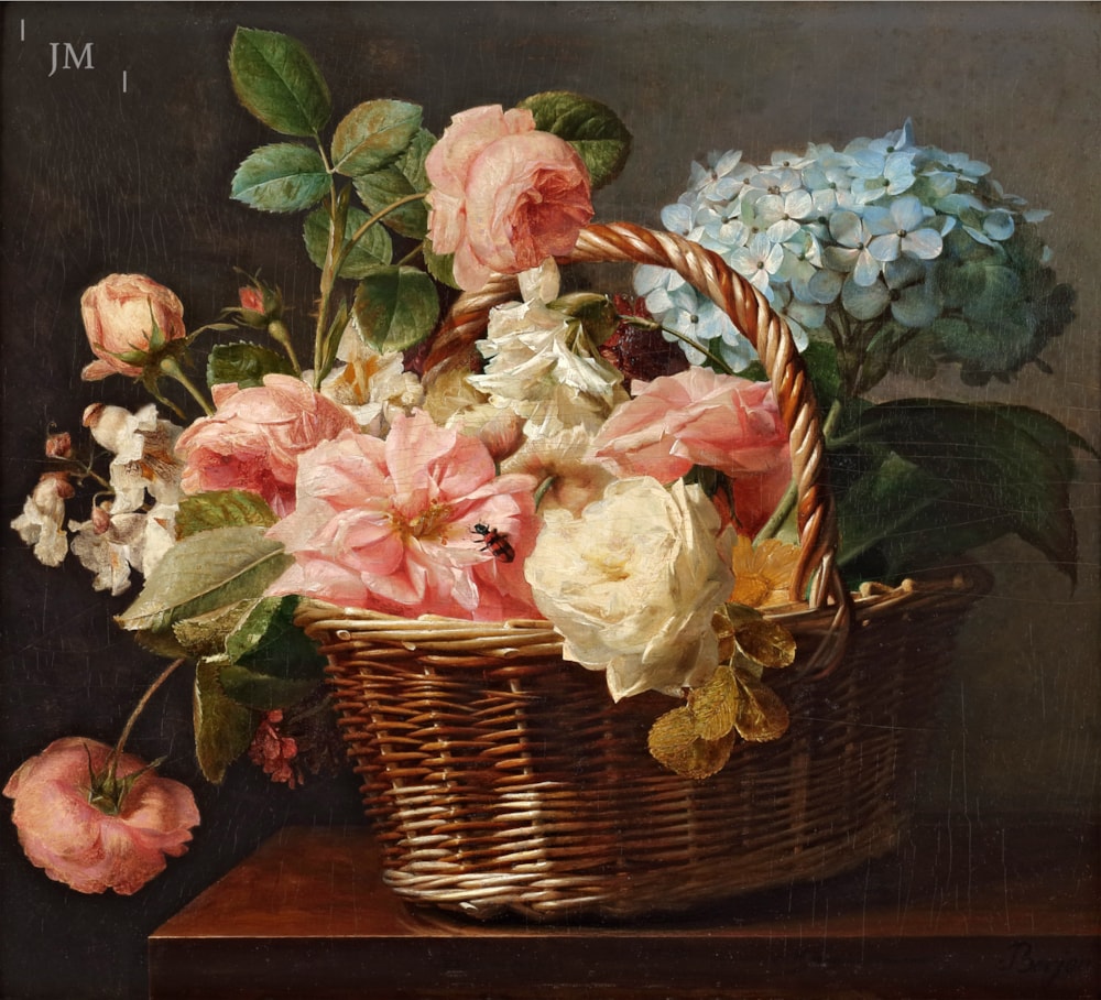 Here, then, is one of them, a magical flowerpiece which my brother and I have always been intrigued to see, but which, until now, has been hidden away for a generation. In terms of quality it compares favourably with the exclusive cadre of museum examples, in particular the Louvre’s Bouquet de lis et de roses dans une corbeille posée sur une chiffonière of 1814, in which there is the same interplay between luxuriant flowers and the hard textures of woven basket and marble. With the composition filling all the pictorial space, and flowers or leaves reaching into three corners, this is unmistakably Berjon at his best; everyday summer flowers mysteriously achieve monumentality and neo-classical grandeur, and one is reminded why an early critic claimed, more than a century ago, that his paintings have ‘la sensation de réalité et de beauté des meilleurs Chardin.’
