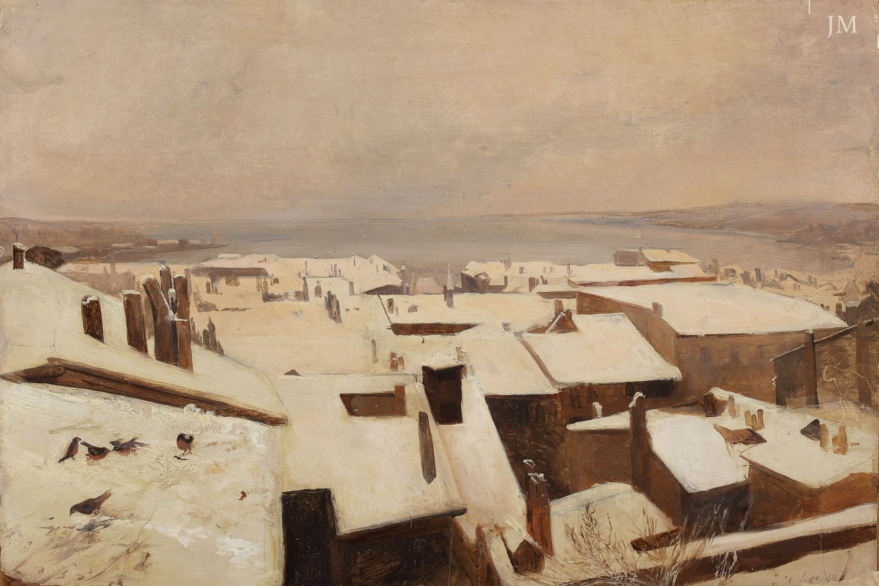 This wintry study in oils was painted from Lugardon’s studio window in the vieille ville area of the city. The Musée d’Art et d’Histoire in Geneva has another sketch by Lugardon of the same view but seen in summer. The villages of Cologny and Collonge-Bellerive can be seen on the south shore of the lake far off to the right. The rooftops bound in snow are reminiscent of Gustave Caillebotte’s Paris scenes painted in the 1870s. Together with Gabriel Loppé, the Geneva-born Albert Lugardon studied for a year in Alexandre Calame’s studio and between 1849 and 1851 he went to the Louvre to copy Old Master paintings under Barthélemy Menn’s tutelage. He travelled extensively within Switzerland spending every summer from 1865 onwards painting either in the Bernese Oberland or in the Valais where, in stark contrast to this more personal oil sketch, he made some large format Alpine landscapes including the one which featured in our Peaks & Glaciers exhibition in 2008. His paintings can be seen in the major museums of Bern, Geneva, Zurich and Luzern and towards the mid 1880’s Lugardon began to experiment with photography and the Moment-Photographie movement in London and Geneva.