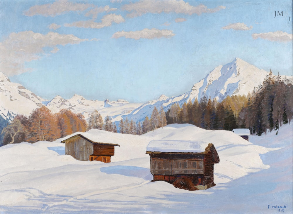 Colombi came from a Swiss Italian family in Bellinzona and having studied architecture in Winterthur, decorative art in Paris and Bern, he had become an independent painter by 1900. Thanks to his apprenticeship as a designer and poster artist Colombi could turn his hand to engraving, lithography and woodcuts as well as oils and watercolours with equal aplomb. He began painting snow scenes in these early years when living near Lake Thun in the Bernese Oberland from where he made frequent forays into Graubunden and the Engadine.