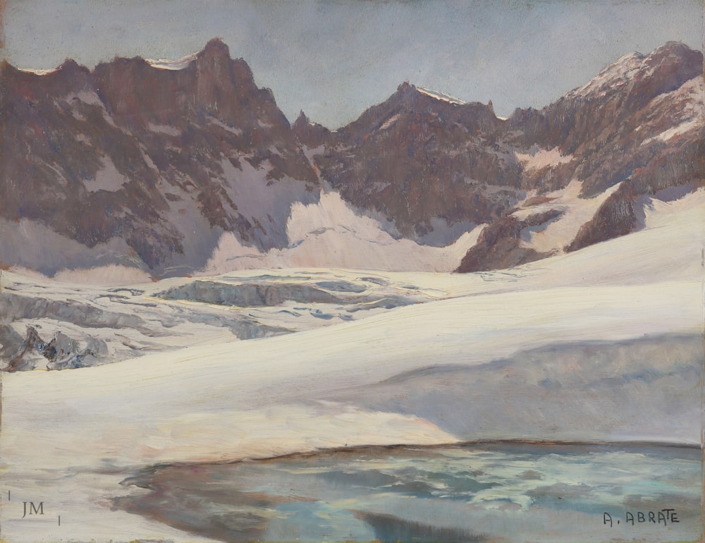 To get this view across the Talèfre Glacier on the eastern flank of the Mont Blanc massif, Abrate would have been up at about 2,800 metres. As well as noting the location, the painter’s inscription on the back of the panel records the time of year as spring. The strong shadows from the peaks and the glare from the glaciers would suggest Abrate was working under a midday sun. Looking from left to right, one sees the Aiguille de Savoie with a thick cornice below the summit, the Aiguilles de Talèfre, de l’Eboulement and beginning of the north ridge of the Aiguille de Leschaux- a first ascent for him in 1923.