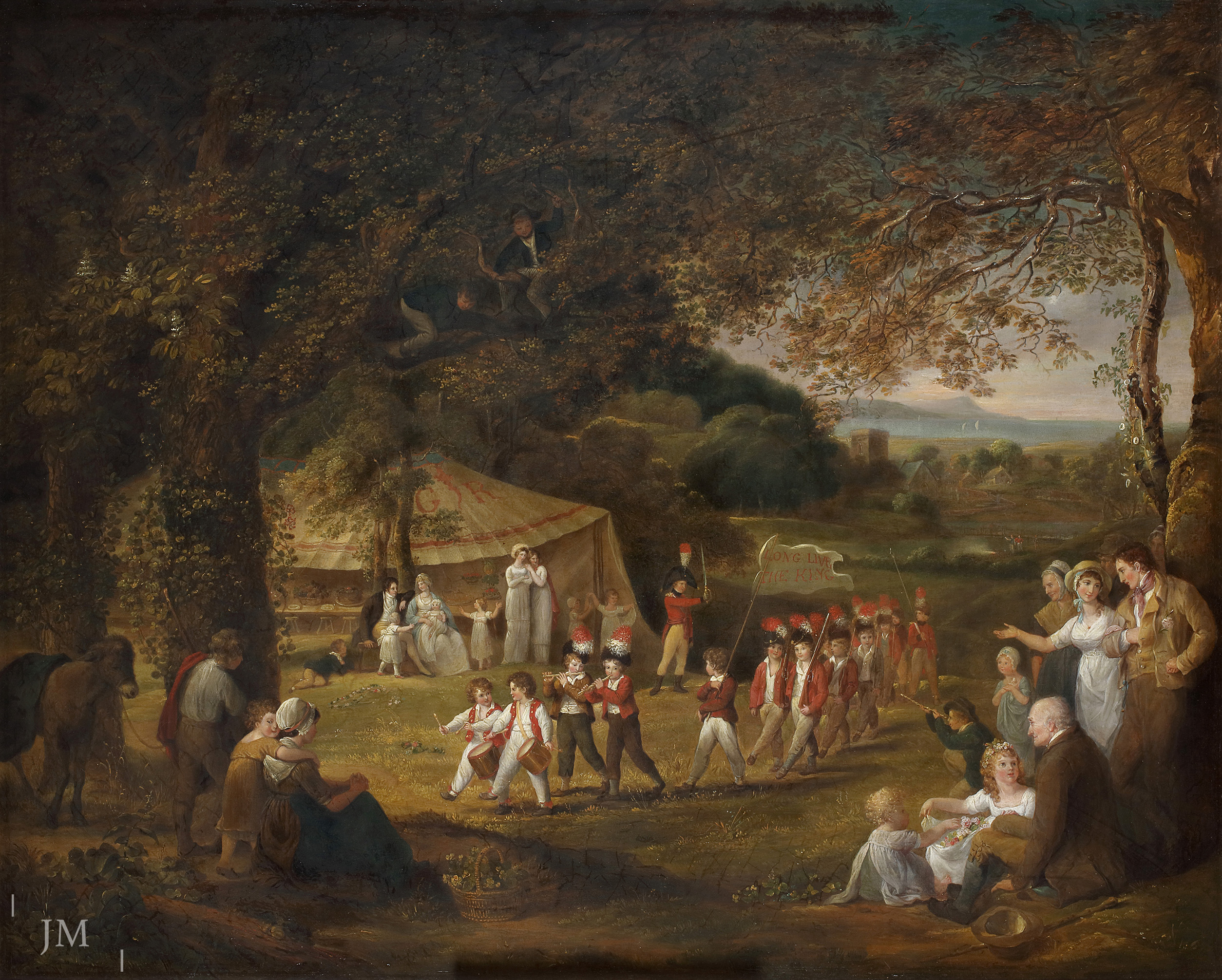 In this ‘fete champetre’, children play at soldiers and march past the older generations who look fondly on, while in the background there is a pretty tent adorned with the king’s cipher, with one side open to reveal a feastladen table. In the tender expressions of the figures, and the innocent, bucolic feel we are reminded of the pastoral amusements of George Morland, while the figures themselves are not unlike those of another contemporary, Julius Ibbetson. There is a painting by Maria in Tate Britain, The Schoolmistress (1803), showing a crowded schoolroom in which, surprisingly, harmony and order are maintained. Not surprisingly, despite its anachronistic vision of English life, the artist›s rather naive style and her complete obscurity, this long-neglected painting has been rushed out of storage for public display at Millbank alongside more familiar themes such as ‘Women in Revolt’!