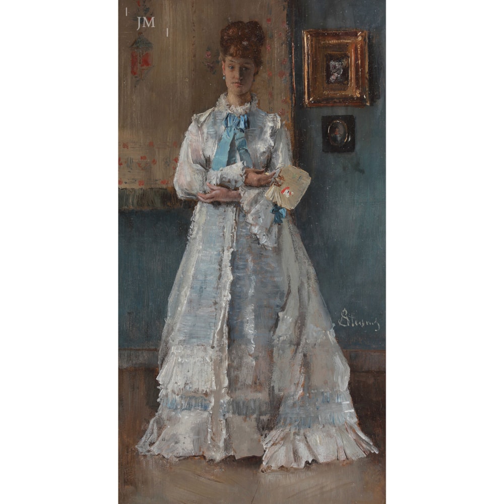 This picture should not be admired as a portrait so much as an evocation of mood and sophistication. After all, this model is no stranger to his paintings, and here, one feels, Stevens revels in a virtuoso rendition of her dazzling dress and the shimmering blue satin at her neck rather than wishing to tell us very much about the young lady posing for him. It is enough that she bears the faintest of smiles, and that her beautifully-rendered hands express repose and contentment. Classic Stevens trademarks, as well, are her small fan in the Japanese style, the two pictures on the wall (perhaps one of his own scarce flowerpieces?) and the clever reflection of fabrics on the polished parquet floor.