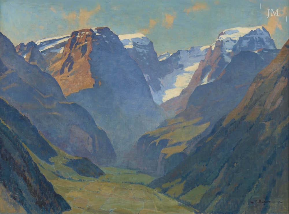 Burger’s palette of shifting greens used to capture the shadows, pastures and the forested flanks is highly effective. The contrast between the snow-capped summits and the mist above the valley is especially striking in this composition.