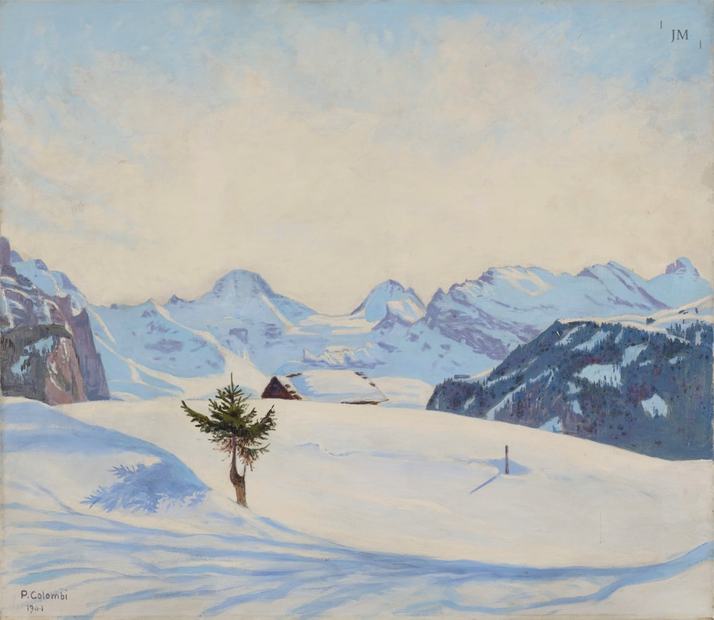 The V-shaped col between the Lauterbrunnen Breithorn and the Tschingelhorn to its right seems to echo the outstretched branches of the solitary pine tree in this serene mountainscape by Colombi. The view was taken from above Mettlenalp just beyond Wengernalp where the Jungfrau descends into the steep Lauterbrunnen Valley. The thawing snow on the shed’s roof suggests a late winter or spring in this accomplished sunlit panorama which relies on delicate areas of ultramarine violet to replicate both the mountain flanks and the shadows of the larger tree out of sight.