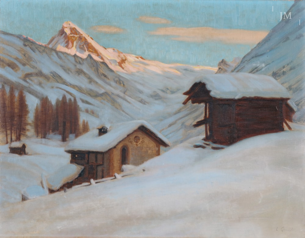 Seen from any angle, the Dent Blanche is a stand-alone, majestic high mountain that, rising to 4537 metres, dwarfs its surroundings. The Swiss painter Gianoli painted this late afternoon view from the other side of the valley, at the southern end of the Val d’Hérens in a small hamlet called les Haudères. It is a remote location even today, especially in deep winter.