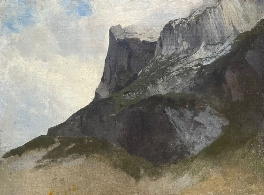 This Bernese Oberland scene comes from the Vente Calame which was held in Paris’s Hôtel Drouot a year after the painter died. The auction of all the contents of his studio was conducted over two days and included hundreds of oil sketches and drawings. Although Calame enjoyed an international success as the most important Swiss landscape painter of the early nineteenth century, he never sold his preparatory studies. As such, the studio sale revealed to what extent he had been devoted to working directly from nature -en plein air -as many of his sketches, or modelli, such as this one of the Eiger, were never converted into formal studio paintings. This speaks volumes about the difference between Calame the artist and Calame the studio entrepreneur who was already receiving more commissions by the early 1850s than he could carry out, see, for example our Mountain torrent below the Balmhorn.