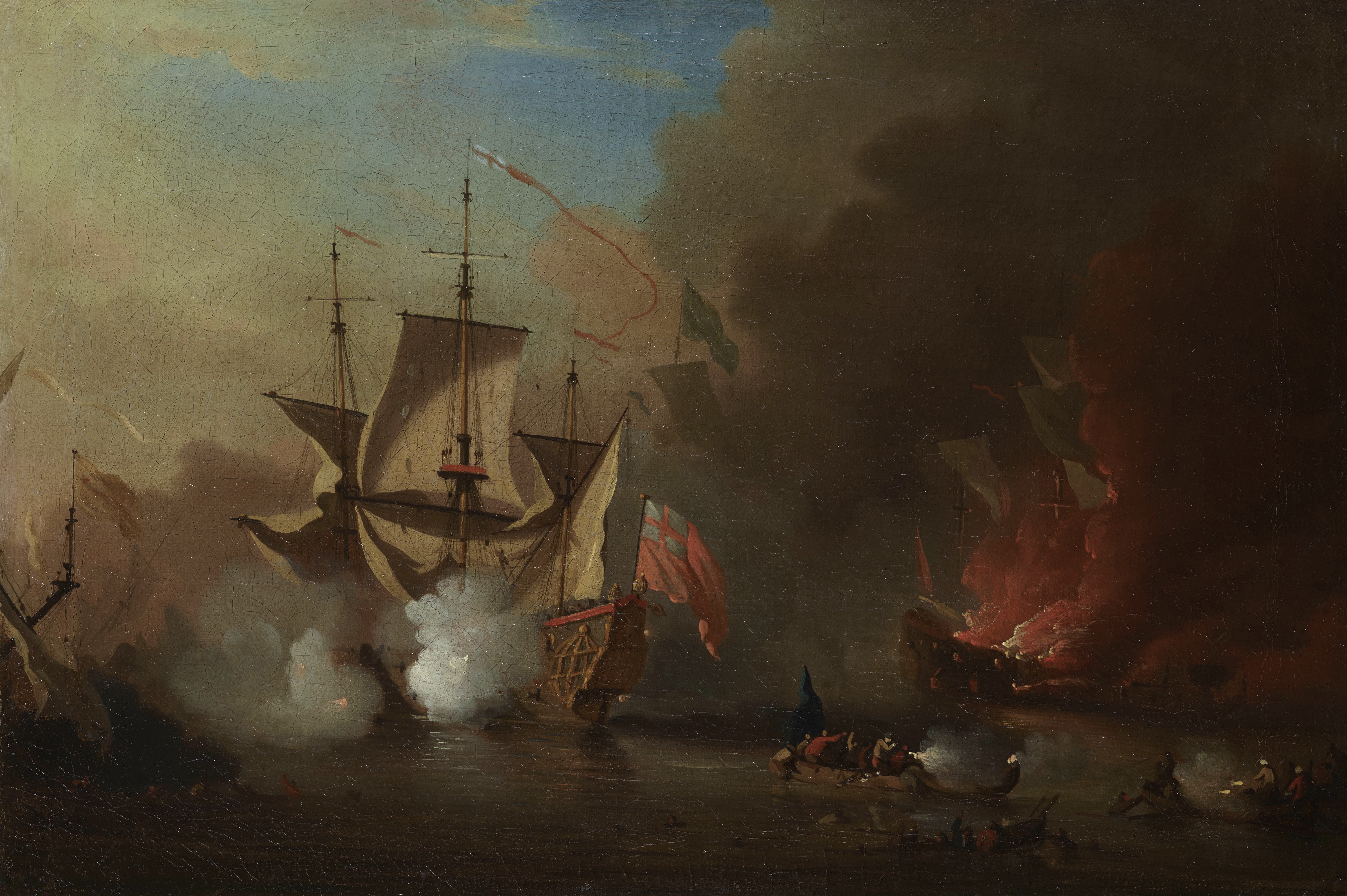 An English ship in action with Barbary ships at night