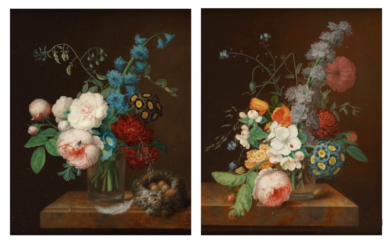 Still lifes depicting roses, auriculae, morning glory and other flowers in a glass vase on a marble ledge - a pair